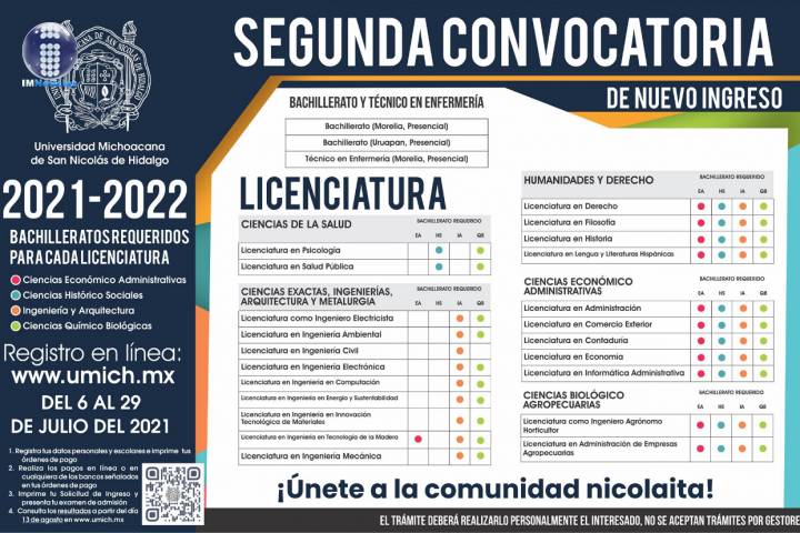 La Universidad Michoacana de San Nicolás de Hidalgo (UMSNH) informa que este jueves 29 de julio a las 23:59 horas, cierra la segunda convocatoria de nuevo ingreso aprobada por el H. Consejo Universitario para los programas educativos que registran espacios disponibles. La segunda convocatoria fue publicada el pasado 6 de julio y contempla 22 programas educativos de Nivel Superior, Técnico en Enfermería y Bachillerato en la ciudad de Morel...