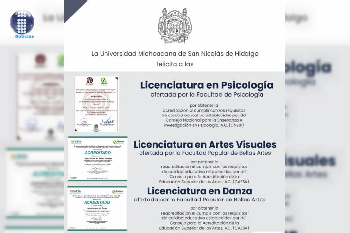La Universidad Michoacana de San Nicolás de Hidalgo (UMSNH), informa que durante el periodo de mayo y junio del presente año se efectuaron 6 visitas con fines de acreditación en modalidad virtual en los Programas Educativos de Psicología, Artes Visuales, Ingeniería en Tecnología de la Madera, Ingeniería en Computación, Danza e Informática Administrativa, los cuales fueron evaluados por diversos Organismo nacionales e internacionales in...