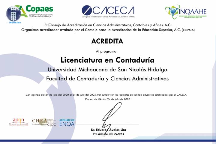 NOTICIAS 24/07/2020CACECA acredita los programas de Licenciatura en Contaduría y Administración de la UMSNH