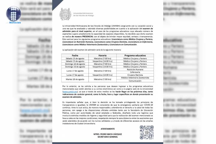 NOTICIAS 15/08/2020Inicia examen de admisión para licenciaturas del área de salud que ofrece la UMSNH Con transparencia, orden y seguridad, este sábado inició la aplicación del examen de admisión para las licenciaturas del área de salud y para la Licenciatura en Comunicación que ofrece la Universidad Michoacana de San Nicolás de Hidalgo (UMSNH).