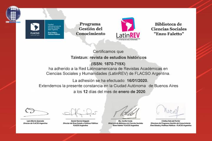La Universidad Michoacana de San Nicolás de Hidalgo (UMSNH) informa que Tzintzún. Revista de Estudios Históricos, fue aceptada para adherirse a la Red Latinoamericana de Revistas Académicas en Ciencias Sociales y Humanidades (LatinRev) de FLACSO Argentina.