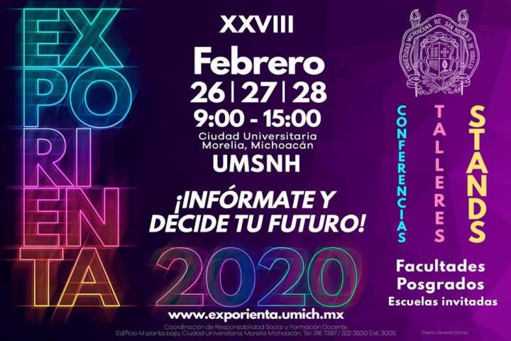 La Universidad Michoacana de San Nicolás de Hidalgo (UMSNH) realizará del 26 al 28 de febrero "ExpOrienta 2020", la cual tiene como objetivo difundir entre los jóvenes la oferta académica que ofrece la máxima Casa de Estudios del Estado.