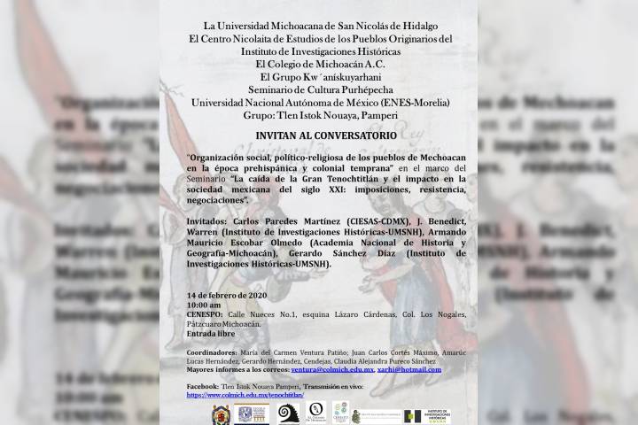 NOTICIAS 29/01/2020Conversatorio sobre la organización social, político-religiosa en la e´poca prehispánicaLa Universidad Michoacana de San Nicolás de Hidalgo (UMSNH), en coordinación con el Centro Nicolaita de Estudios de los Pueblos Originarios del Instituto de Investigaciones Históricas, el Colegio de Michoacán A.C., el Grupo Kw´anískuyarhani, Seminario de Cultura Purhépecha, la Universidad Nacional Autónoma de México (ENES-Morelia) y el grupo Tlen Istok Nouaya, Pamperi, invitan al conversatorio "Organización social, político-religiosa d... Ver más...