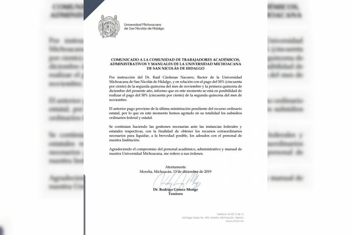 NOTICIAS 13/12/2019La UMSNH refrenda su máximo esfuerzo para cumplir con el pago de salarios a los trabajadores universitariosAutoridades de la Universidad Michoacana de San Nicolás de Hidalgo, ordenaron realizar este 13 de diciembre la dispersión del pago del 50 por ciento de la segunda quincena de noviembre, misma que adeudaba a los trabajadores universitarios.