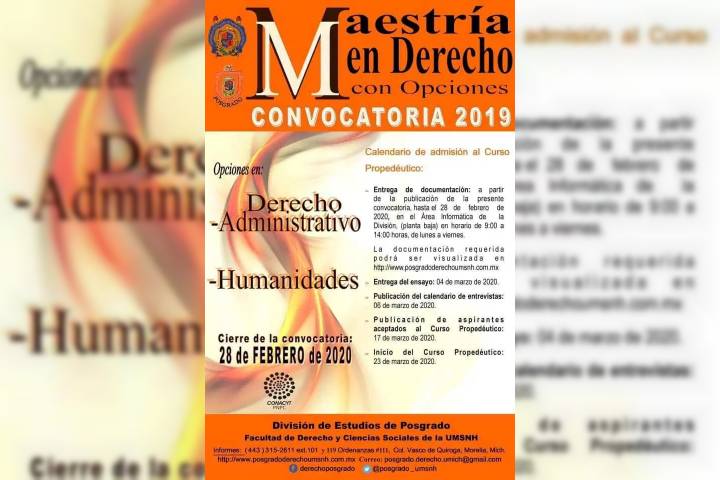 Como un programa único en su tipo a nivel nacional la Facultad de Derecho y Ciencias Sociales de la Universidad Michoacana de San Nicolás de Hidalgo (UMSNH), invita a los egresados de la licenciatura a participar en la convocatoria para su MaestrÃa en Derecho con opciones en Derecho Administrativo y Humanidades.