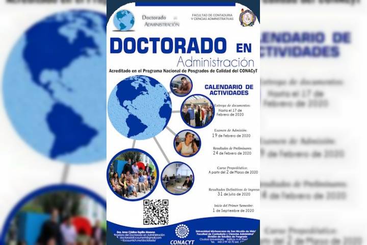 Con un plan de estudios acreditado ante el Programa Nacional de Posgrados de Calidad del (Conacyt), la Facultad de ContadurÃa y Ciencias Administrativas de la Universidad Michoacana de San Nicolás de Hidalgo (UMSNH) a través de la División de Estudios de Posgrado, convoca a investigadores y profesionales en el área administrativa a participar en la convocatoria de ingreso a su Doctorado en Administración para el periodo 2020-2024.