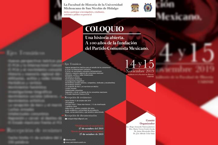 La Facultad de Historia de la Universidad Michoacana de San Nicolás de Hidalgo invita a investigadores, estudiantes, activistas y público en general a participar en su próximo Coloquio "Una historia abierta. A 100 años de la fundación del Partido Comunista Mexicano", que se llevará a cabo en el auditorio de la institución el próximo mes de noviembre.