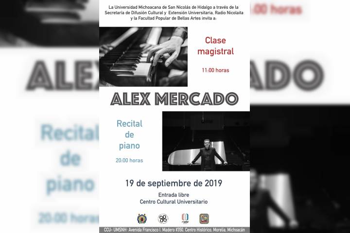 Como parte de las actividades que permiten vincular a la radio con otras dependencias de la Universidad Michoacana en acciones tendientes a colocar a esta emisora universitaria como un medio público que amplía su relación con la sociedad y complementa su función social; el pianista mexicano, Alex Mercado, ofrecerá -el 19 de septiembre- la clase magistral "La improvisación como herramienta de expresión" y un concierto a piano solo.