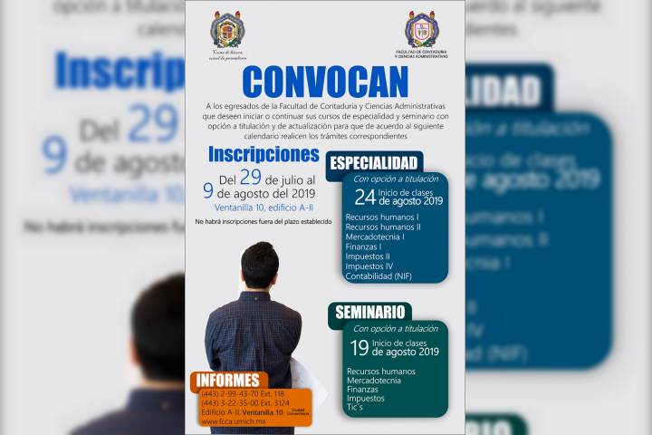 La Facultad de Contaduría y Ciencias Administrativas de la Universidad Michoacana de San Nicolás de Hidalgo convoca a los egresados de la institución, a realizar los trámites correspondientes para iniciar o continuar con sus cursos de especialidad y seminario con opción a titulación y de actualización, que se impartirán en agosto.