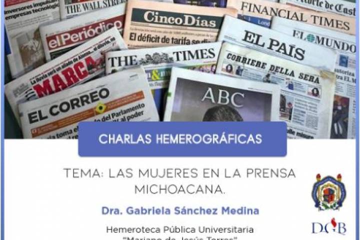 La Universidad Michoacana de San Nicolás de Hidalgo a través de la Hemeroteca Pública Universitaria "Mariano de Jesús Torres", hace una cordial invitación a su próxima charla hemerográfica que estará a cargo de la Dra. Gabriela Sánchez Medina, directora general de Bibliotecas de la Casa de Hidalgo.
