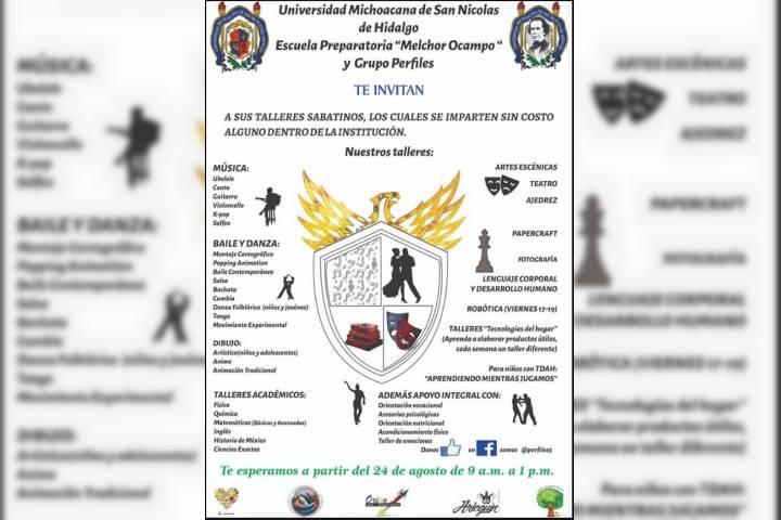 A manera de complemento para la formación integral de los estudiantes de nivel medio superior de la Universidad Michoacana de San Nicolás de Hidalgo, la Escuela Preparatoria "Melchor Ocampo" a través del Grupo Perfiles, invita a los estudiantes nicolaitas de los diferentes semestres de bachillerato a sus Talleres sabatinos que iniciarán durante el presente mes de agosto.