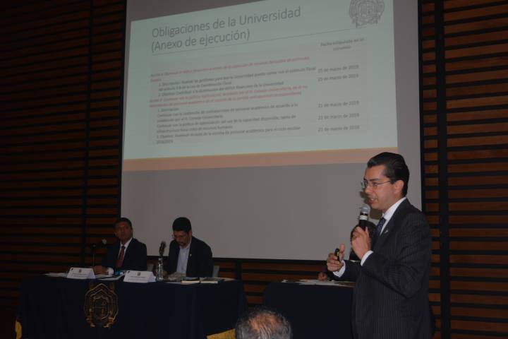 El rector Raúl Cárdenas Navarro presentó a los miembros del Consejo Universitario un informe sobre el avance en el cumplimiento del Convenio de Apoyo Financiero de Recursos Públicos Federales Extraordinarios no Regularizables, firmado en pasado 21 de diciembre de 2018 por el entonces rector Medardo Serna González, con el Gobierno federal.