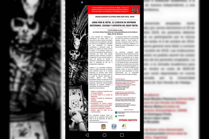 Con la finalidad de incentivar el estudio e investigación del heavy metal, a través de historiar e interpretar la diversidad de escenas, así como dar voz a los protagonistas y seguidores, la Universidad Michoacana de San Nicolás de Hidalgo (UMSNH), a través de la Facultad de Historia, y la Universidad Nacional Autónoma de México (UNAM, a través del Instituto de Investigaciones Antropológicas, convocan a la Jornada académica en estudio... Ver más...