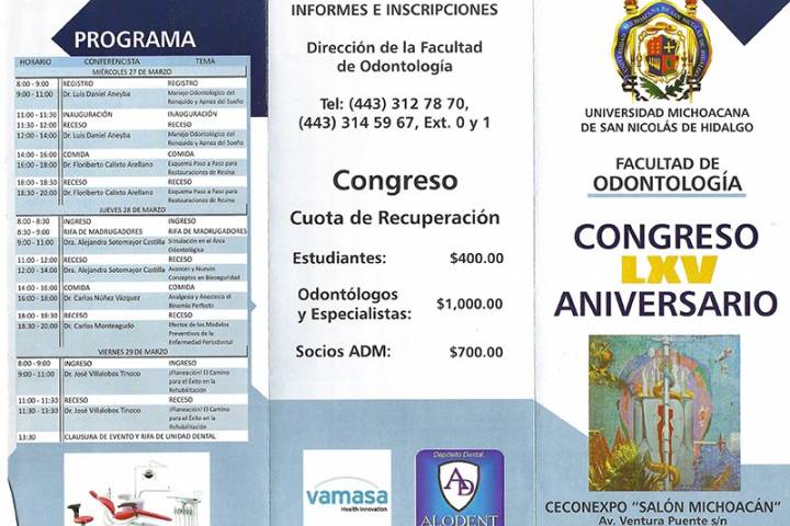 Con motivo de la celebración de su LXV Aniversario, la Facultad de Odontología de la Universidad Michoacana de San Nicolás de Hidalgo, se prepara para realizar su Congreso de aniversario, con la participación de reconocidos conferencistas a nivel nacional e internacional.