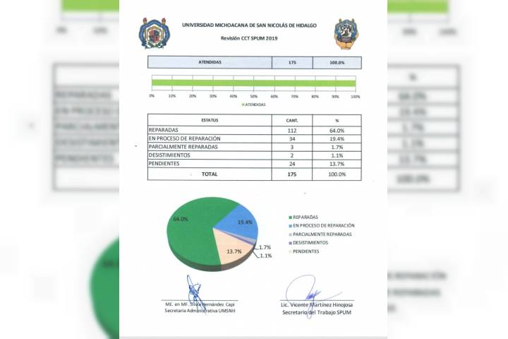 De acuerdo con la información minutada por las autoridades universitarias y sindicales, el 100 % de las peticiones contenidas en los emplazamientos a huelga por parte del Sindicato de Profesores de la Universidad Michoacana (SPUM) fueron atendidos y, en su mayoría, resueltos satisfactoriamente. En cuanto a la revisión salarial (que en la UMSNH es anual), y con base en un documento enviado por la Dirección General de Educación General Uni...
