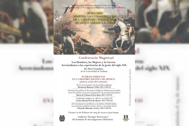 Con la primera sesión dedicada a los Pueblos indígenas en la Historia Política de México, este fin de semana arranca el Seminario "Aportes a la construcción de la Historia Política de México y América Latina" organizado por el Instituto de Investigaciones Históricas (IIH) y la Facultad de Historia de la Universidad Michoacana de San Nicolás de Hidalgo. La primera de cinco sesiones que conforman el seminario dará inicio este viernes ...