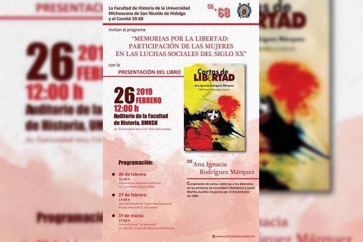 Como un testimonio de los hombres y mujeres presos a raíz de la agitación por los movimientos estudiantiles de 1968 en la Ciudad de México, la activista Ana Ignacia Rodríguez Márquez, conocida como "La Nacha", presentará en la Universidad Michoacana de San Nicolás de Hidalgo su libro titulado "Cartas de libertad". El libro es una compilación de cartas de las y los detenidos en las prisiones de Santa Martha Acatitla y Lecumberri como co...