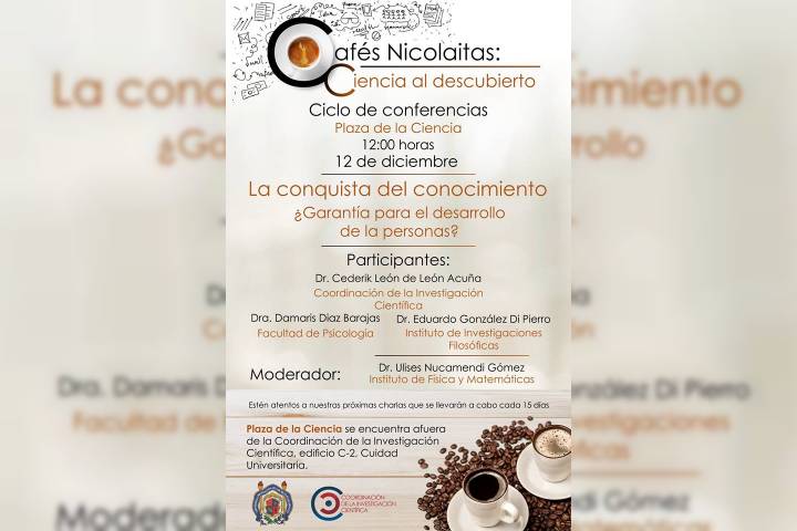 Cederick León de León Acuña, Damaris Díaz Barajas y Eduado González Di Pierro, investigadores destacados de la Universidad Michoacana de San Nicolás de Hidalgo, disertarán en el Café Nicolaita Ciencia al Descubierto, sobre el tema "La conquista del conocimiento: ¿Garantía par el deasrollo de las personas?. A las doce del día en la Plaza de la Ciencia, ubicada al pie de las oficinas de la Coordinación de la Investigación Científic...