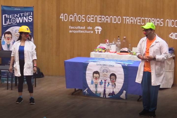 A través de un diálogo dinámico entre una pareja de payasos científicos, "Cientificlowns: Teatro, Circo y Ciencia. La ciencia como nunca antes la habías visto", logró captar la atención y despertar la curiosidad de los universitarios y alumnos de sexto de primaria que acudieron a este evento de la Coordinación de la Investigación Científica de la Universidad Michoacana de San Nicolás de Hidalgo.