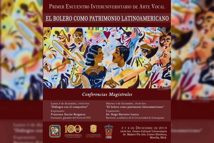 NOTICIAS 30/11/2018UMSNH organiza encuentro para fomentar la música mexicana entre sus alumnosDedicado al bolero latinoamericano, la proxima semana tendrá lugar el Primer Encuentro Interuniversitario de Arte Vocal "El bolero como patrimonio latinaomericano", en la Universidad Michoacana de San Nicolás de Hidalgo.
