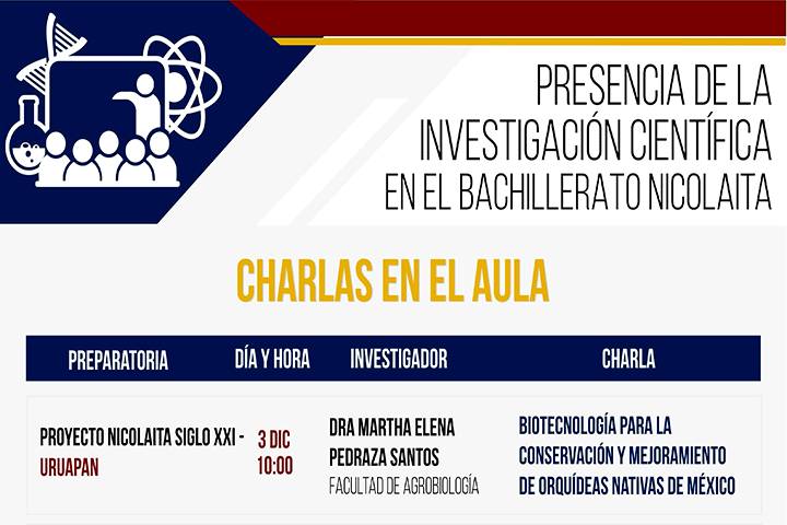 NOTICIAS 30/11/2018Continuarán en preparatorias incorporadas a la UMSNH las "Charlas en el Aula" durante el mes de diciembreEn el marco del programa Presencia de la Investigación Científica en el Bachillerato Nicolaita, durante el mes de diciembre se continuará en las preparatorias incorporadas a la Universidad Michoacana de San Nicolás de Hidalgo con las "Charlas en al Aula" a través de las cuales investigadores nicolaitas entran en contacto con los alumnos a través de una clase, para difundir el conocimiento científico que han generado durante su trayectoria ... Ver más...