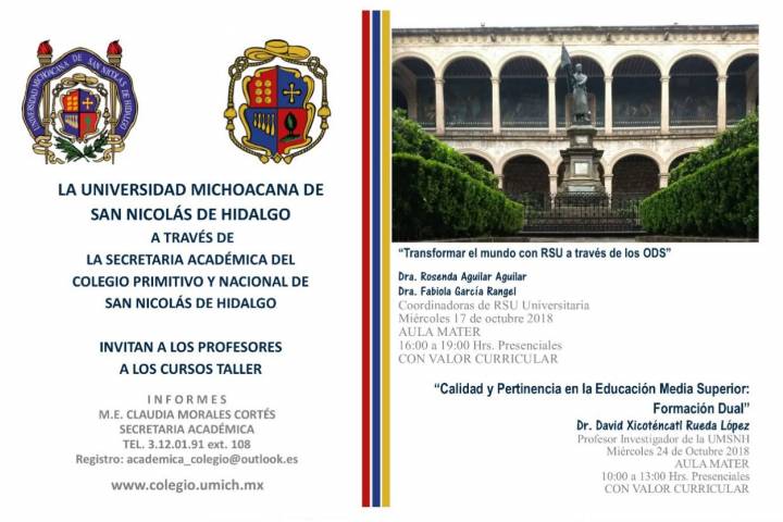 La Universidad Michoacana de San Nicola?s de Hidalgo invita a los profesores nicolaitas del Bachillerato, a los cursos taller sobre Responsabilidad Social Universitaria (RSU), que se impartirán en el Colegio Primitivo y Nacional de San Nicolás de Hidalgo.