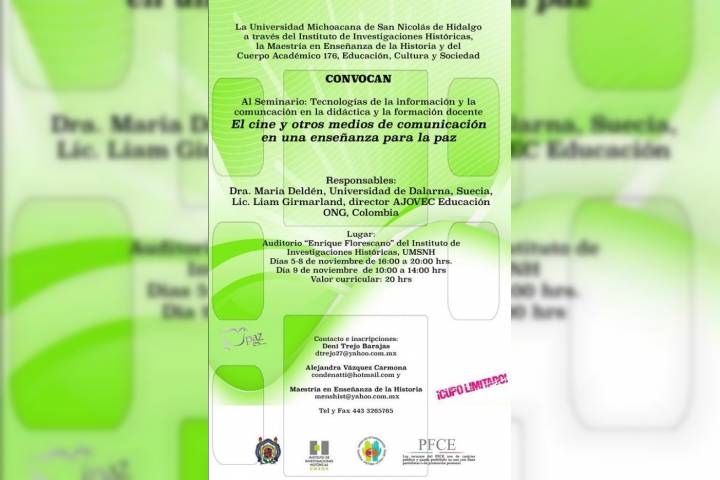 La Universidad Michoacana de San Nicolás de Hidalgo, a través del Instituto de Investigaciones Históricas, invita a la comunidad nicolaita del área de las Ciencias en Humanidades y personas interesadas en el tema, a participar en el Seminario TecnologÃas de la Información y la Comunicación en la Didáctica y la Formación Docente, que se llevará a cabo el próximo mes de noviembre en dicha dependencia académica.