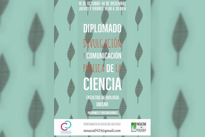 La Facultad de BiologÃa en conjunto con la Coordinación de la Investigación CientÃfica de la Universidad Michoacana de San Nicolás de Hidalgo, invitan a la comunidad universitaria y público en general al diplomado sobre "Divulgación y comunicación pública de la ciencia" que dará inicio el próximo 18 de octubre.