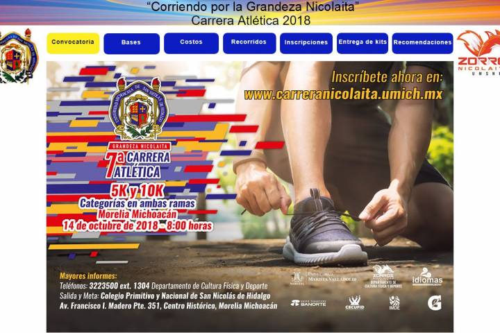 Continúa abierta la convocatoria para la 7ª Carrera Atlética "Grandeza Nicolaita", que se realiza para conmemorar el 101 aniversario de la Universidad Michoacana de San Nicolás de Hidalgo, el próximo domingo 14 de octubre. Todavía es tiempo de registrarse para participar en esta fiesta deportiva, práctica que forma parte del programa de estudios de la Casa de Hidalgo, como parte del fortalecimiento de la salud y la sana convivencia. ...