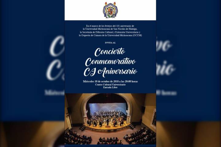 Con la finalidad de conmemorar el 101 Aniversario de la Universidad Michoacana de San Nicola?s de Hidalgo, el próximo miércoles 10 de octubre la Orquesta de Cámara de la Universidad Michoacana ofrecerá un magno concierto. Para esta fecha especial, la OCUM interpretará el estreno mundial de un joven compositor moreliano egresado de la Facultad Popular de Bellas Artes; la Marcha de Zaragoza, orquestada por una alumna de la misma Facultad,...