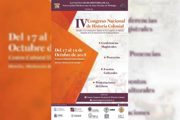 La Universidad Michoacana de San Nicola?s de Hidalgo invita a la comunidad nicolaita y público en general al IV Congreso Nacional de Historia Colonial "Rumbo a los centenarios: Quinto de la Conquista de México / Segundo de la Consumación de la Independencia". El evento es coordinado por la Facultad y el Instituto de Investigaciones Históricas y se desarrollará del 17 al 19 de octubre de 2018, en el cual se contemplan conferencias magist...