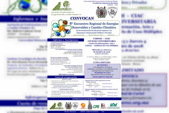 En la búsqueda de un desarrollo sostenible con la participación y compromiso de la sociedad en general, la Universidad Michoacana de San Nicolás de Hidalgo a través de la Facultad de IngenierÃa Mecánica, convoca a investigadores, docentes y alumnos a participar con la difusión de sus trabajos de investigación en modalidad de cartel, en el 8º Encuentro Regional de EnergÃas Renovables y Cambio Climático.