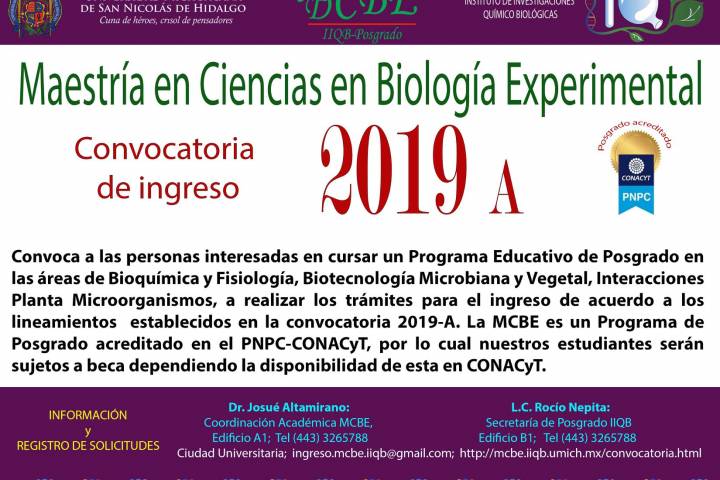 El Instituto de Investigaciones QuÃmico Biológicas, dependiente de la Universidad Michoacana de San Nicolás de Hidalgo, informa que se encuentra abierta la convocatoria para cursar la MaestrÃa en Ciencias en BiologÃa Experimental.
