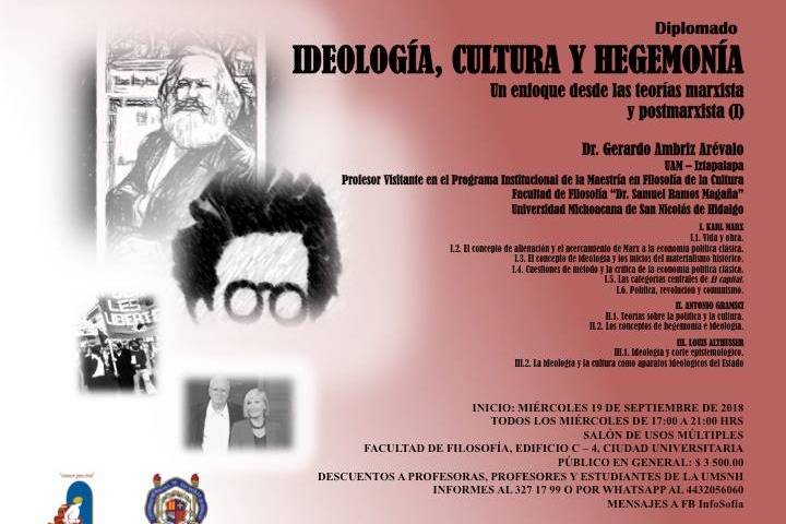 IdeologÃa, cultura y hegemonÃa, un enfoque desde las teorÃas marxista y postmarxista, es el tema del diplomado que ofrecerá la Facultad de FilosofÃa "Dr. Samuel Ramos Magaña" de la Universidad Michoacana, importido por el investigador Gerardo Ambriz Arévalo de la Universidad Autónoma Metropolitana.
