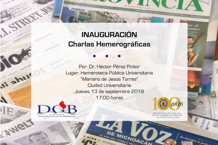 La Universidad Michoacana de San Nicolás de Hidalgo invita a la inauguración de las "Charlas Hemerográficas", que se llevarán a cabo en las instalaciones de la Hemeroteca Pública "Mariano de Jesús Torres" ubicada en Ciudad Universitaria.
