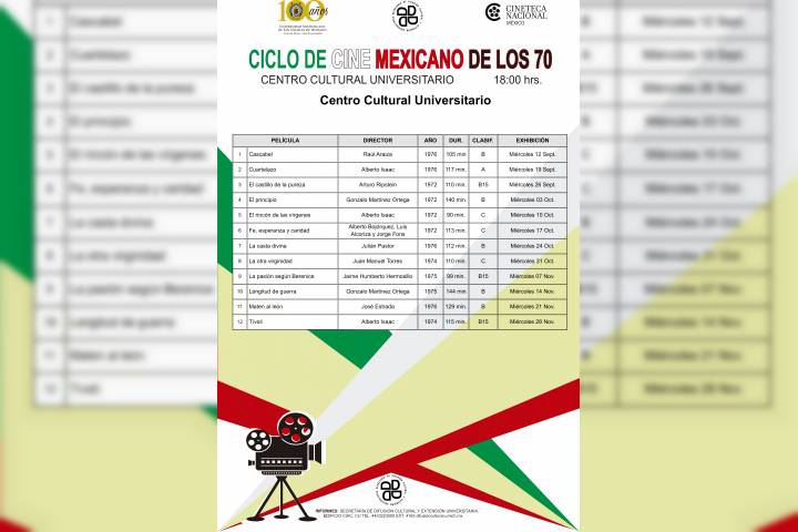 La Universidad Michoacana de San Nicolás de Hidalgo, en coordinación con la Cineteca Nacional, llevará a cabo a partir del próximo 12 de septiembre, el "Ciclo de cine mexicano de los años setenta" en el Centro Cultural Universitario.