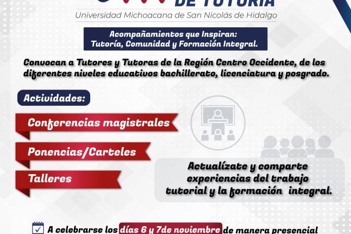 NOTICIAS 01/09/2025Tutoras y tutores de la Región Centro Occidente de la ANUIES se reunirán en la UMSNH La Universidad Michoacana de San Nicolás de Hidalgo (UMSNH) y la Red de Tutorías de la Región Centro Occidente de la Asociación Nacional de Universidades e Instituciones de Educación Superior (ANUIES) invitan al VIII Encuentro Regional de Tutoría "Acompañamientos que Inspiran: Tutoría, Comunidad y Formación Integral", que se llevará a cabo el próximo mes de noviembre.