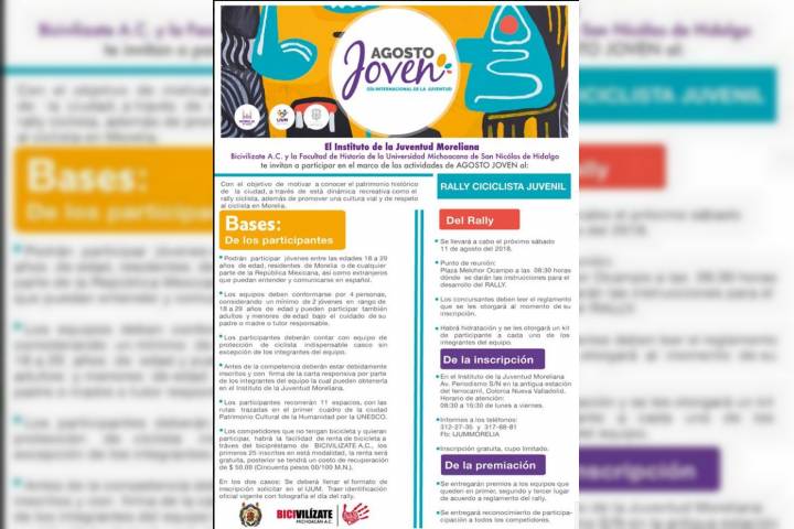 Con el objetivo de motivar a los participantes para conocer el patrimonio histórico de Morelia, la Facultad de Historia de la Universidad Michoacana de San Nicolás de Hidalgo, se suma a la convocatoria del Instituto de la Juventud Moreliana y la asociación civil Bicivilízate, para que la comunidad nicolaita participe en el Rally Ciclista Juvenil "Agosto Joven". A través de esta dinámica recreativa que se llevará a cabo el próximo sá...
