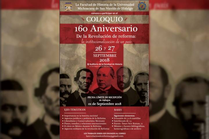 La Universidad Michoacana de San Nicolás de Hidalgo convoca a través de su Facultad de Historia, a participar en el coloquio, que con motivo del 160 Aniversario de la Revolución de Reforma, llevará a cabo con el tema "La institucionalización de un país". Los ejes temáticos de este evento académico versarán sobre la importancia para la Historia Nacional de la Revolución de la Reforma, sus aspectos jurídicos y políticos; el liberal...