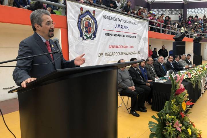 Al fungir como padrino de 335 alumnos de la generación 2015-2018 de la Escuela Preparatoria Emiliano Zapata, incorporada a la Universidad Michoacana de San Nicolás de Hidalgo, Serna González convocó a los egresados a hacer lo que les apasiona ... Ver más...