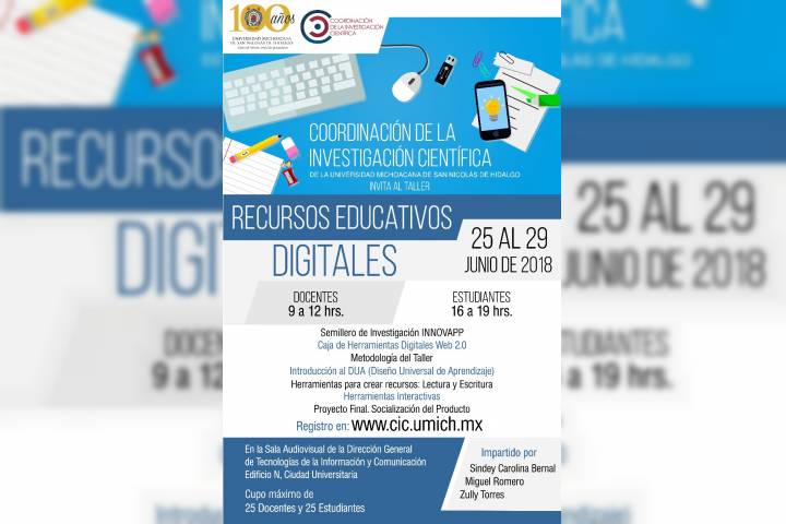 La Coordinación de Investigación Científica de la Universidad Michoacana de San Nicolás de Hidalgo, en continuidad con la labor de capacitación en materia de herramientas para fortalecer el proceso de enseñanza-aprendizaje, ofrece el taller denominado "Recursos educativos digitales".