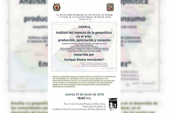 La Universidad Michoacana de San Nicolás de Hidalgo, a través de la Facultad Popular de Bellas Artes, invita a la comunidad nicolaita a la charla "Análisis del impacto de la geopolÃtica en el arte; producción, apreciación y consumo".