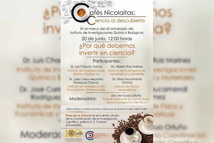 Continuando con el programa de divulgación cientÃfica denominado Cafés Nicolaitas: Ciencia al descubierto, que organiza la Coordinación de la Investigación CientÃfica de la Universidad Michoacana de San Nicolás de Hidalgo, esta semana la charla abordará uno de los aspectos claves para el desarrollo nacional: ¿Por qué debemos invertir en Ciencia?