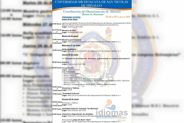 Con la finalidad de conmemorar el 40 aniversario de su fundación, el Departamento de Idiomas de la Universidad Michoacana de San Nicolás de Hidalgo, a través de su Coordinación General, invita a una serie de actividades académicas y recreativas del 25 al 29 de junio.