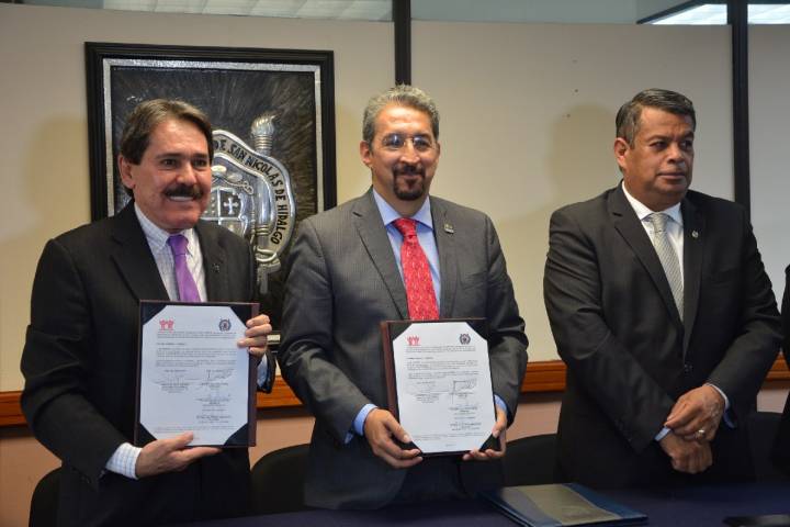 Durante la firma de un convenio de colaboración establecido entre la Universidad Michoacana y el ... Ver más...