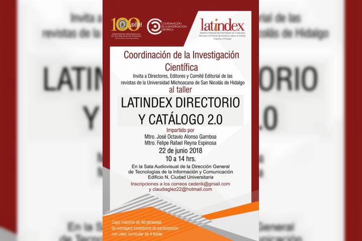 La Coordinación de Investigación CientÃfica de la Universidad Michoacana de San Nicolás de Hidalgo, para dar continuidad a la capacitación de los editores de revistas nicolaitas en la web, llevará a cabo el próximo 22 de junio el taller "Latindex directorio y catálogo 2.0".