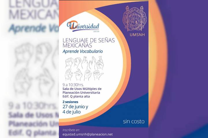La Universidad Michoacana de San Nicolás de Hidalgo, convoca a la comunidad nicolaita y público en general a participar en el curso "Lenguaje de señas mexicanas. Aprende vocabulario", el cual se desarrollará los dÃas 27 de junio y 4 de julio del presente año.