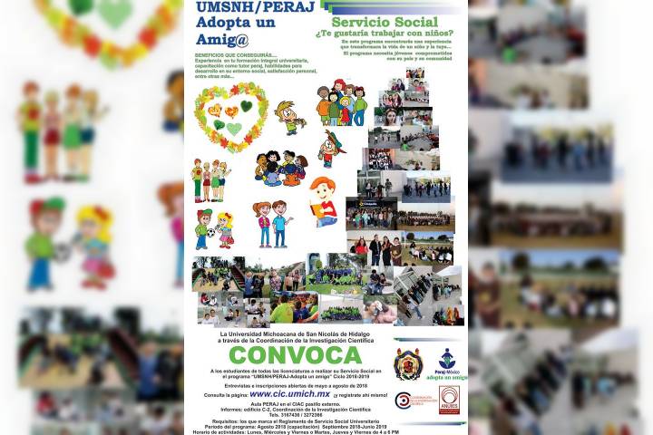 Como parte de la vinculación y responsabilidad social universitaria, la Casa de Hidalgo invita a sus alumnos de licenciatura a participar en el programa "UMSNH-Peraj Adopta un amig@", patrocinado por la Asociación Nacional de Universidades e Instituciones de Educación Superior (ANUIES) y la propia organización Peraj México.