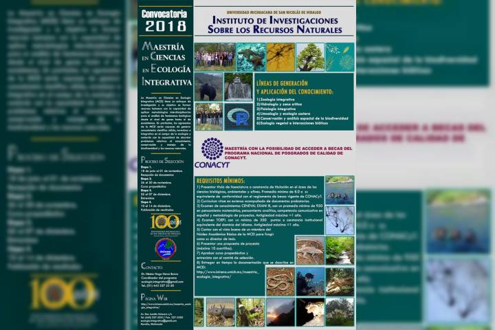 Con un enfoque de investigación para formar profesionales capaces de generar conocimiento científico sólido y abordar la problemática relacionada con el conocimiento, conservación y manejo de la biodiversidad y los recursos naturales, la Universidad Michoacana de San Nicolás de Hidalgo, a través del Instituto de Investigaciones sobre los Recursos Naturales (INIRENA), invita a los interesados a participar en la convocatoria para la Maestr... Ver más...