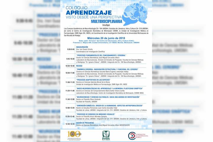 Los Cuerpos Académicos de la Casa de Hidalgo, especializados en el studio de la Neurofisiología CA-194; y de los Estudios de Literatura, Arte y Cultura CA-219; así como el Centro de Investigación Biomédica de Michoacán (CIBIMI), la Unidad de Investigación Médica en Farmacología, CMN Siglo XXI y la Coordinación de la Investigación Científica de Nuestra Máxima Casa de Estudios invitan al "Coloquio de Aprendizaje, visto desde una pers... Ver más...